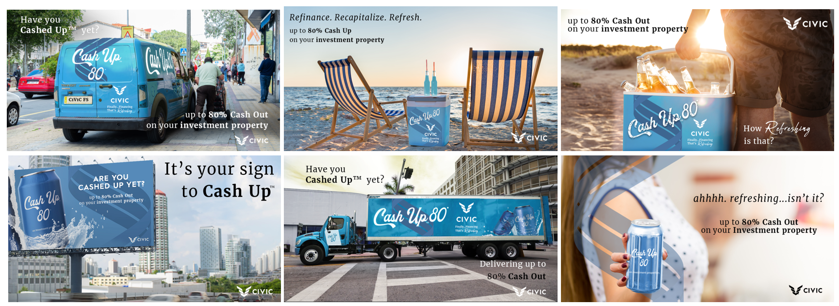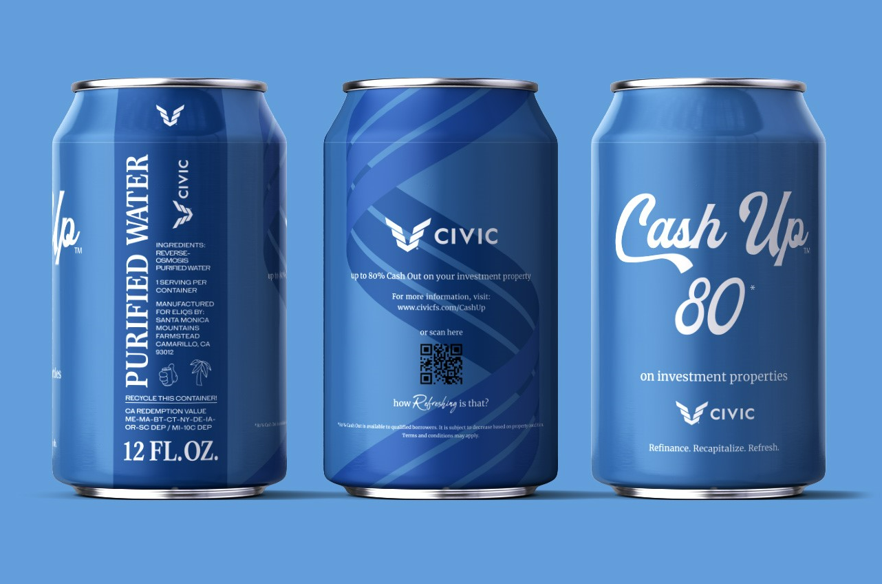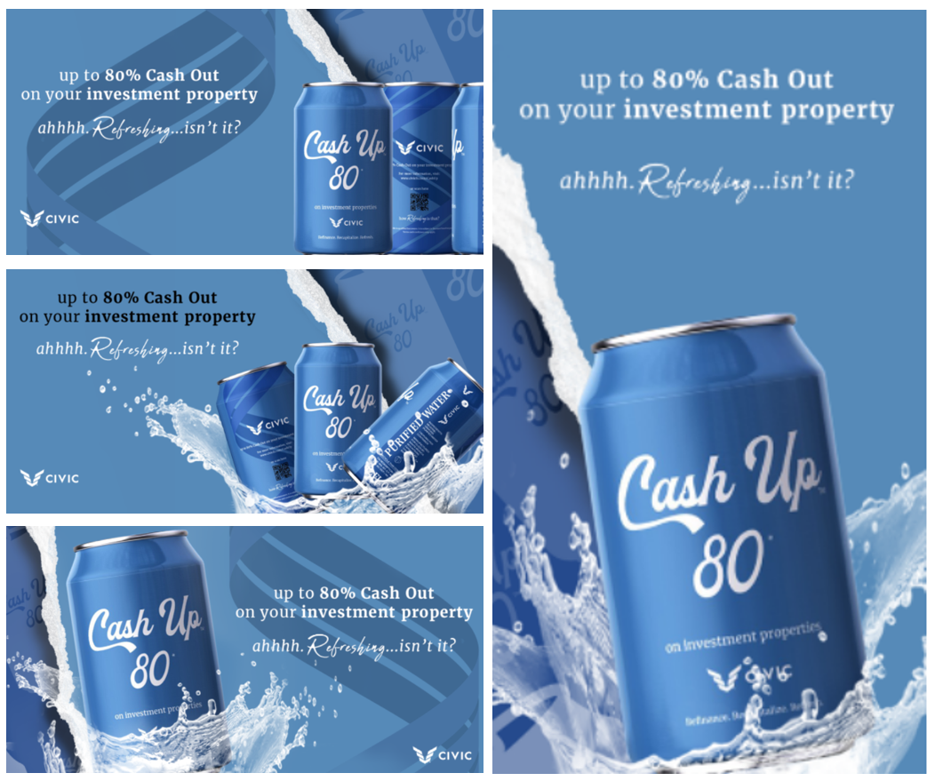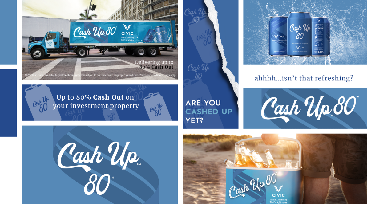 In Phase 3 we brought the product to life by creating Cashup 80 water cans and brought them to our tradeshow. This was a way to get people to physically touch and carry around a non-tangible loan product. This was also launched during the hot Miami IMN conference to help enhance the messaging of “Refreshing”.